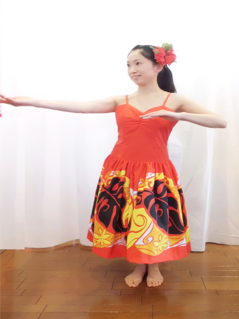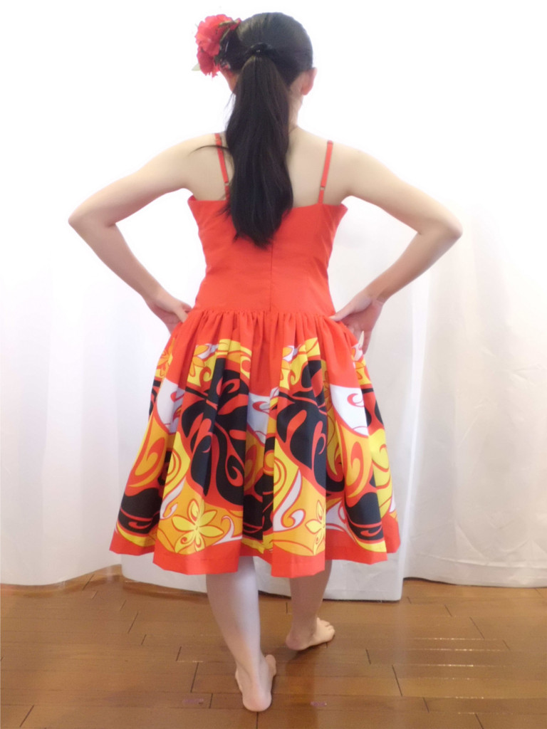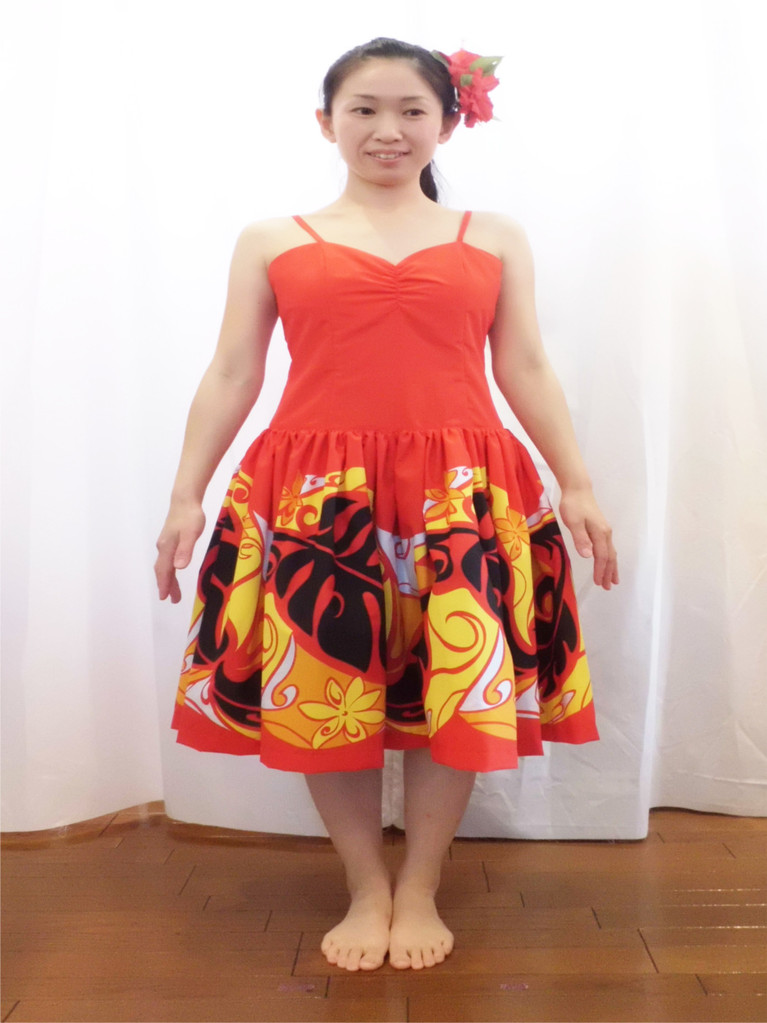 ハートシェイプネックラインにバスト中心にゴムシャーリングのデザインドレス。スカートの接ぎは後中心のみ、なので生地の柄を存分に生かせるドレスです。 燃えるような赤いドレスに仕上がっています。生地の柄を変えると、印象がとても変化するドレスです。